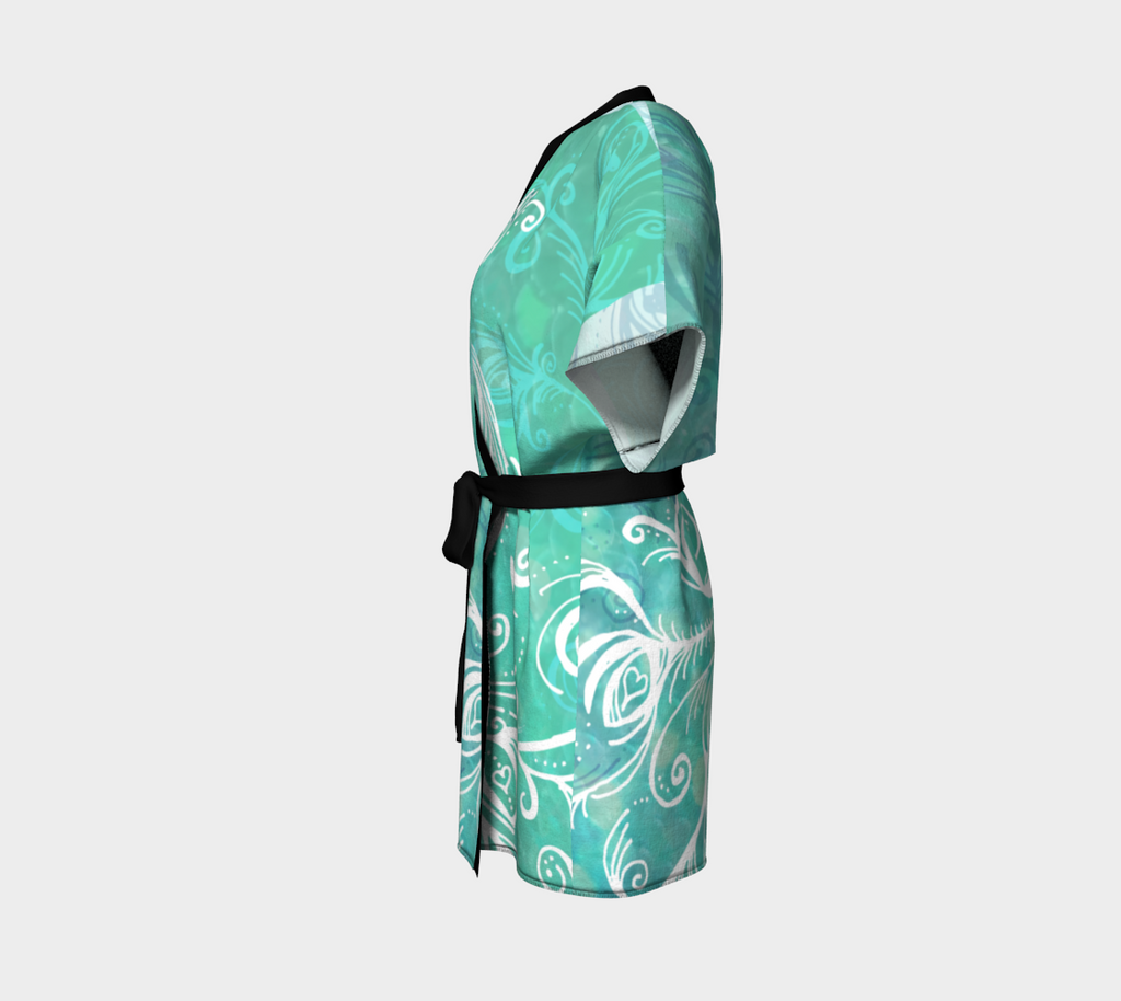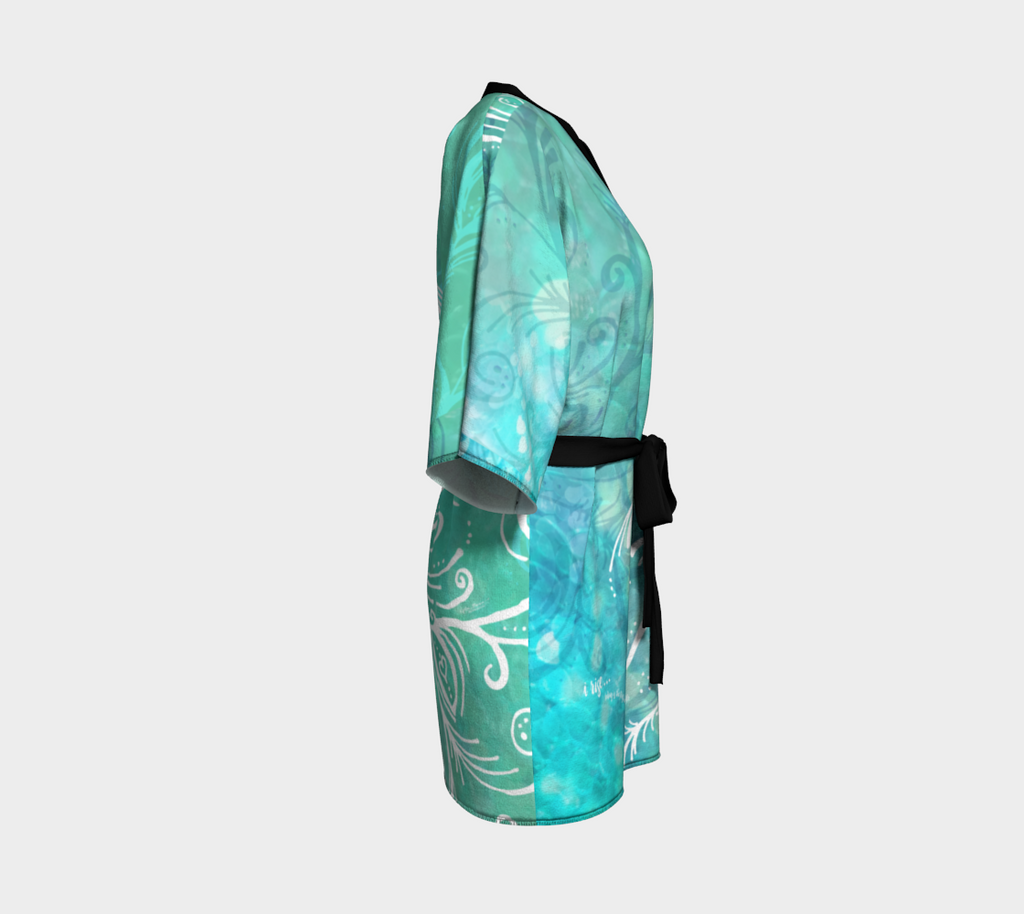 Artwork paired with luxury in this line of kimonos. Dramatic, elegant look. Perfect for special occasions, gallery shows and festivals. The kimono robe features a knit bamboo fabric trim and matching chiffon belt.