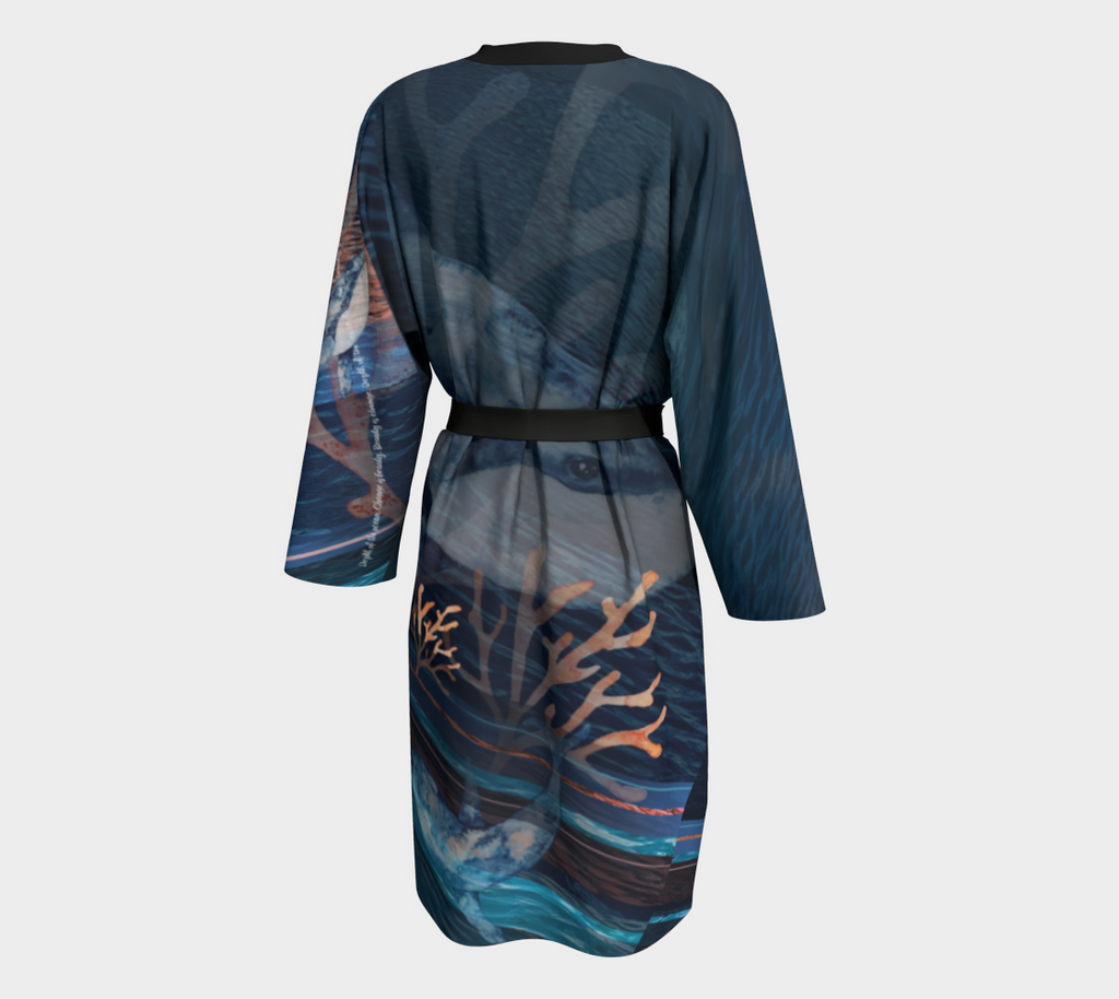 This gorgeous peignoir is a lightweight robe for early mornings and cozy nights. The sleeves extend the length of the arm, and the body of the material extends to about mid-calf. Literally wrap yourself in art.